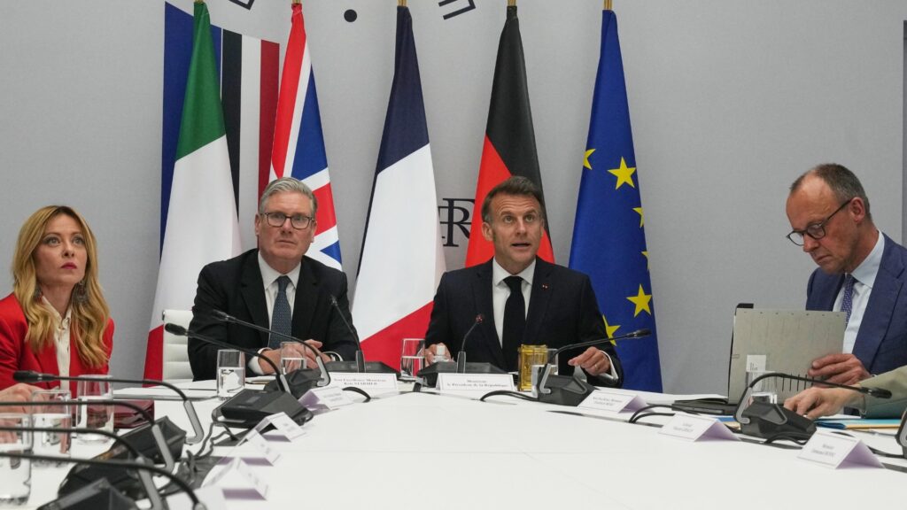 (Da sinistra a destra) Giorgia Meloni,Keir Starmer, Emmanuel Macron e Friedrich Merz alla riunione Volenterosi per Hormuz, (Foto Ansa 2026 EPA/MICHEL EULER / POOL MAXPPP OUT)